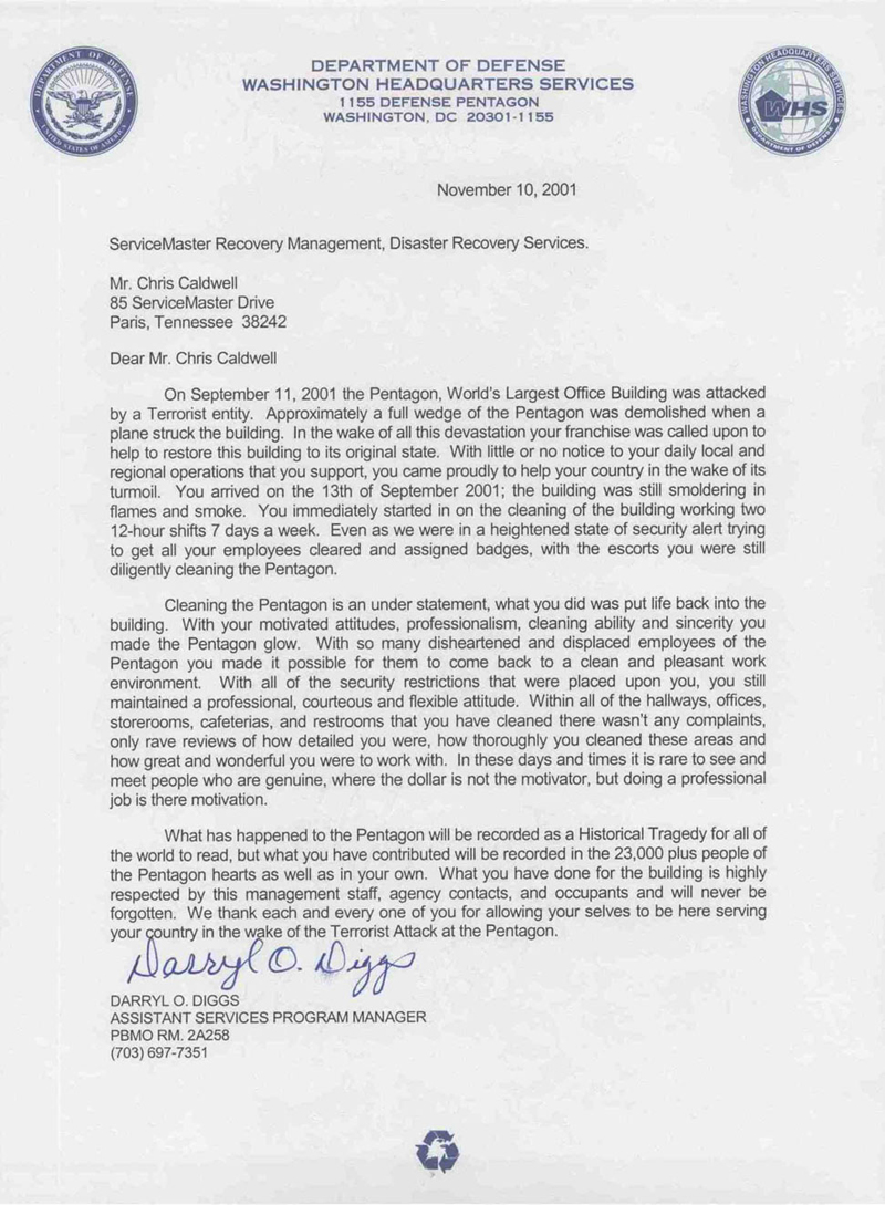 On September 11th, 2001, the Pentagon was attacked by terrorists. A full wedge of the Pentagon was destroyed when a plane flew into the building. ServiceMaster Professional Cleaning of Paris was called in to help restore the Pentagon to its original state. Two days after the attack, we arrived ready to help our country during this difficult time. We immediately started cleaning the building, working two 12-hour shifts, 7 days a week, and did what we could to put the building back together as quickly and efficiently as possible.